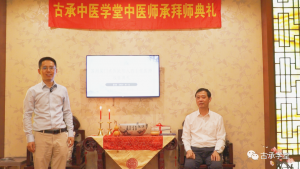仪式开始前,古承学堂刘勋亮校长讲述了两位学子的中医求学之路,袁曦从警官学院毕业后去了一家地产公司做法务工作,生完孩子后就做了全职妈妈。因为孩子的缘故,开始接触中医,并逐渐产生了兴趣。尤其是疫情爆发后,亲眼目睹了针灸的神奇疗效,便萌发了学习中医保护家人健康的想法。陈捷毕业于华东理工大学,起初只是想学习一门门槛高的技术,让未来有更强的抗风险能力。后来随着不断深入学习中医知识,发现中医的知识解决了自己多年关于身体和思维的困扰,还能为身边人的健康送去更多关心,自此便下定决心要通过师承的方式学习中医。刘校长说,欧阳主任是享誉江苏乃至全国的吴门名医,从医四十年来为苏州百姓的健康做出了卓越的贡献,门诊上对待病人关怀备至,医术精湛,深受百姓认可。两位学子能拜师于欧阳老师,既是荣誉,也是责任,既要向老师学习治病救人的医术,更要学习老师的医德仁心,践行古人“人命至重,有贵千金,一方济之,德逾于此”的古训。