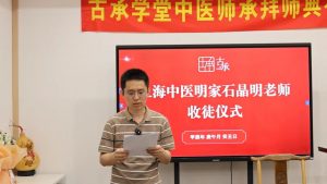 仪式开始,古承学堂刘校长开场致辞,他说,璿枢无停运,蕤宾去后,二气西东。龙潜渌水穴,火助太阳宫,天地阴生万物成。值此良辰,我们齐聚古承学堂,共同见证一场庄重而神圣的中医拜师仪式。感受那份传承千年的医道精神。在这里举行古朴庄重的拜师仪式,是中医一脉相承、薪火相传的最好见证。
